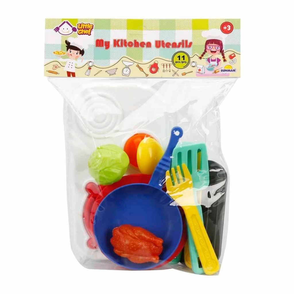 Set içerisinde; Ocak, kaşık, çatal, bıçak, kepçe, kevgir, tabak, tava, tavuk, marul ve kesme tahtası bulunmaktadır.