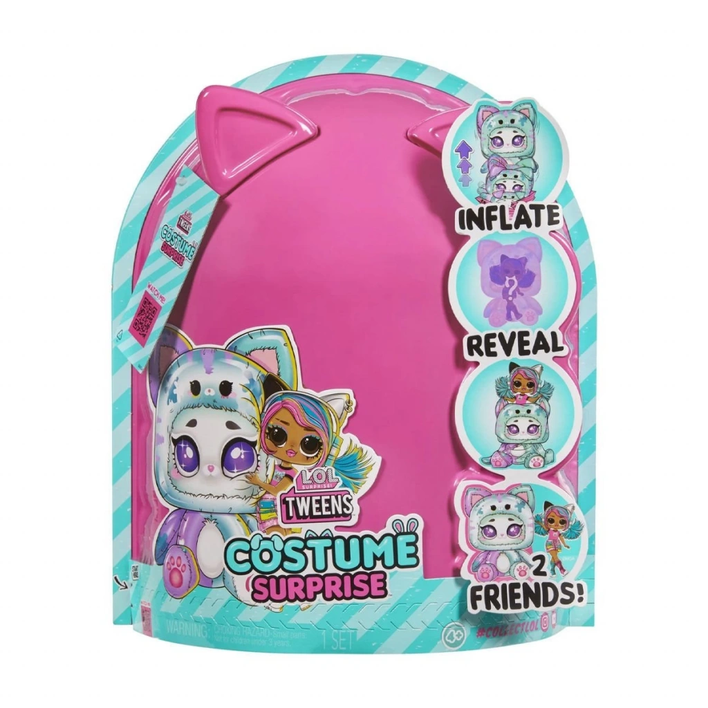 İnanılmaz bir deneyime hazır ol: Paketi Yırt, Kaldır, Şişir ve Parçala! İşte sevimli kedicik kostümüyle Emma Emo karşında! L.O.L. Surprise Tweens Kostüm Sürprizi serisi bir sürü sürpriz ve sevimli bebekleri ile görenleri büyülüyor. Emma Emo'nun yeni trend kıyafetlerini, eteğini ve aksesuarlarını sürpriz paketlerden çıkar ve onu giydir! İpucu: Tweens bebeklerinin ellerini kıyafetleri daha kolay giydirebilmek için çıkarabilirsin. Üstelik bir arkadaşı daha onunla geliyor: Şişebilen evcil hayvan kostümü de beraber oynayabileceğin sevimli bir kedi arkadaşa dönüşüyor. Hayvan kostümünü istediğin zaman tekrar tekrar şişirebilirsin!