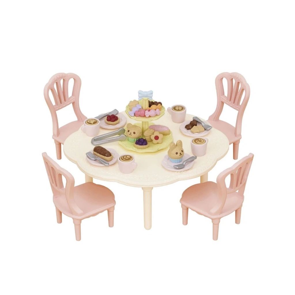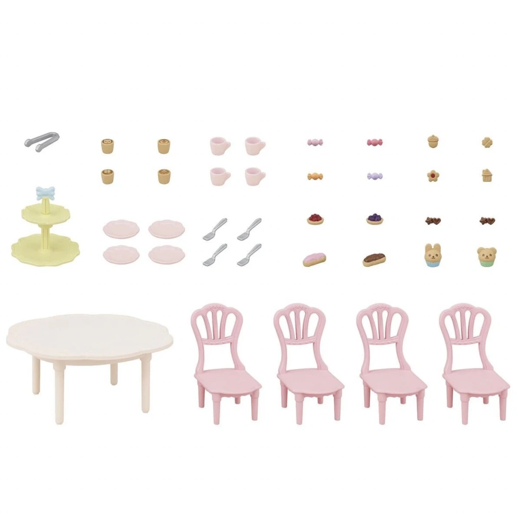 Sylvanian figürleriniz bu partiye davet edilmek için sıraya girecek! Tavşan ve ayı kulaklı cupcakelerden kedili ve penguenli kahvelere kadar rüya gibi tatlılar ile unutulmaz bir parti düzenleyin. Tatlı Parti Seti, misafirleriniz için büyük bir yemek masası, 4 sandalye ve çeşitli aksesuarlar içerir. Çocuklarda yaratıcı taklit etme yeteneğini geliştirir.
