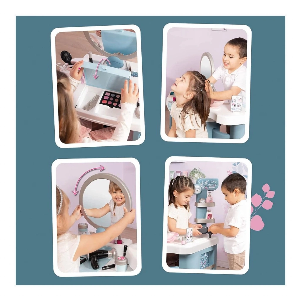 Çok eksiksiz, 3 evreni bir araya getiriyor: kuaförlük, tırnaklar ve makyaj. Çocuğunuz daha sonra kendisini bir makyaj sanatçısının, bir kuaförün ve bir satış elemanının yerine koyabilir.