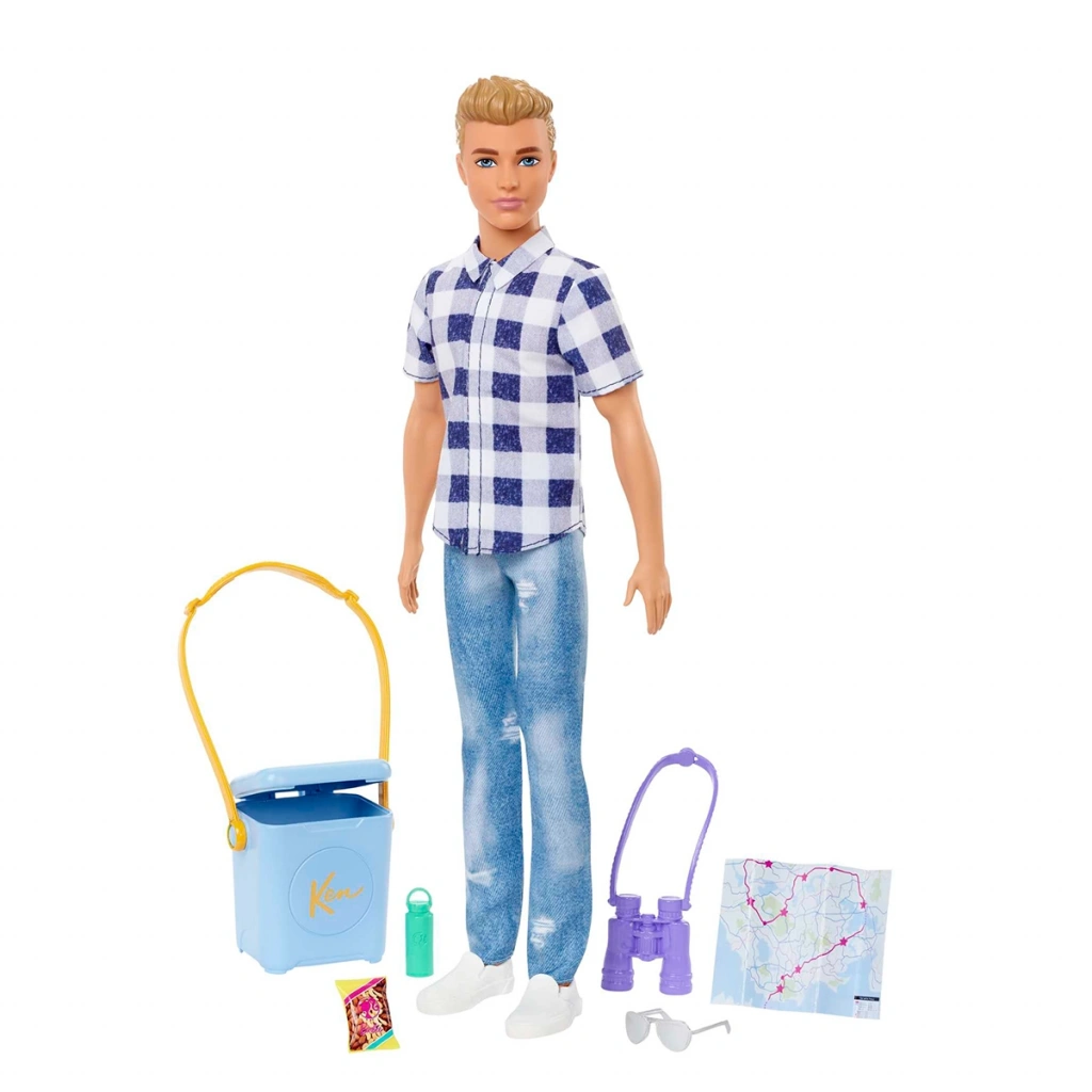 Ken ile kamp eğlencesinin keyfini çıkarın! Mavi ve beyaz ekose desenli, önü düğmeli gömleği, eskitilmiş kot pantolonu ve beyaz spor ayakkabılarıyla Ken, açık havada eğlenmeye hazır.