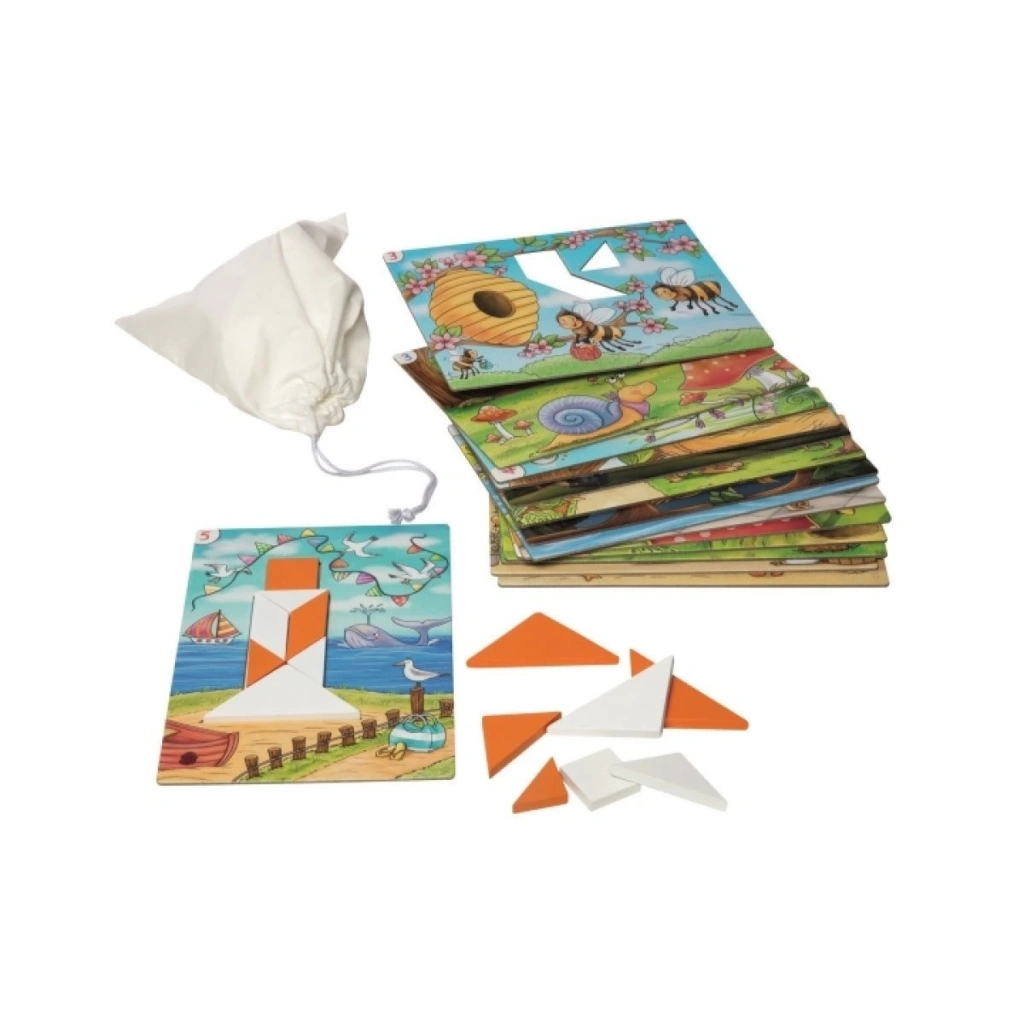 En az 7 adet gerekli olduğu için şekilleri yapmak için parçaları bulmak size bağlıdır. Hangi parçanın nerede olduğu tam belli olmadığından dolayı bu bazen çok zordur. Ancak sabırla devam edersiniz bütün Tangram %27ı çözebilirsiniz.
