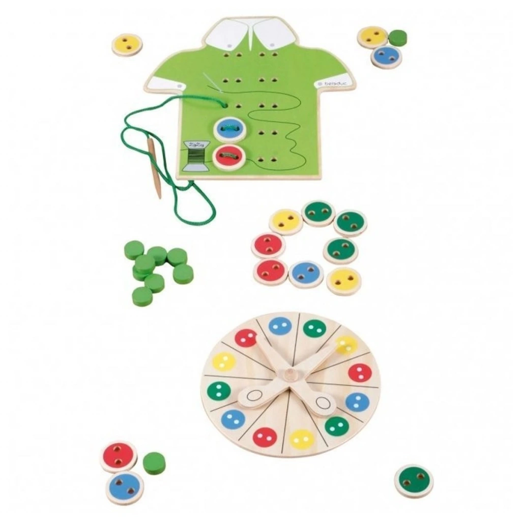 1 Ahşap gömlek. 16 ahşap düğme. İplikli 1 tahta iğne, eğirme için 1 çift makas, 10 fiş